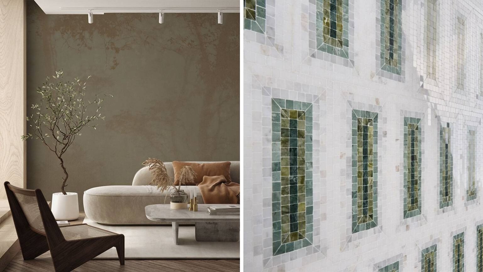Decorate a wall with wallpaper whose pattern and texture resemble frescoes and tempera paintings.
